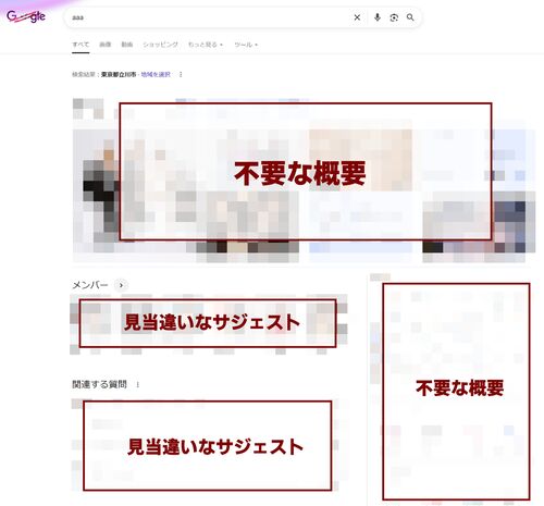 Google検索っていつの間にか以下の要素で、肝心の「検索結果」が全然見えない or 余計なノイズだらけで情報を「自分で検索」して「サイトに訪問して内容を読み取って取捨選択」したり「情報価値を判断する」という行為の純粋さが凄く下がってると思うんです…