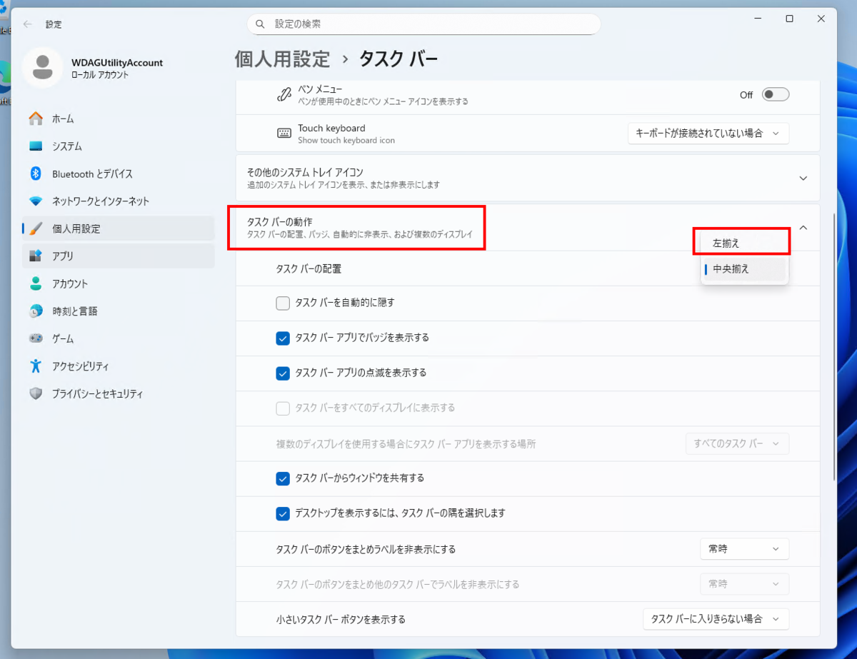 1) タスクバーを左寄せにする