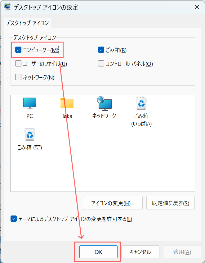 表示される「デスクトップ アイコンの設定」ダイアログで