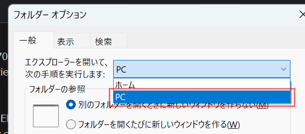 エクスプローラーの上部の「...」 > オプション > Home を 「PC」に変更 > [OK]
